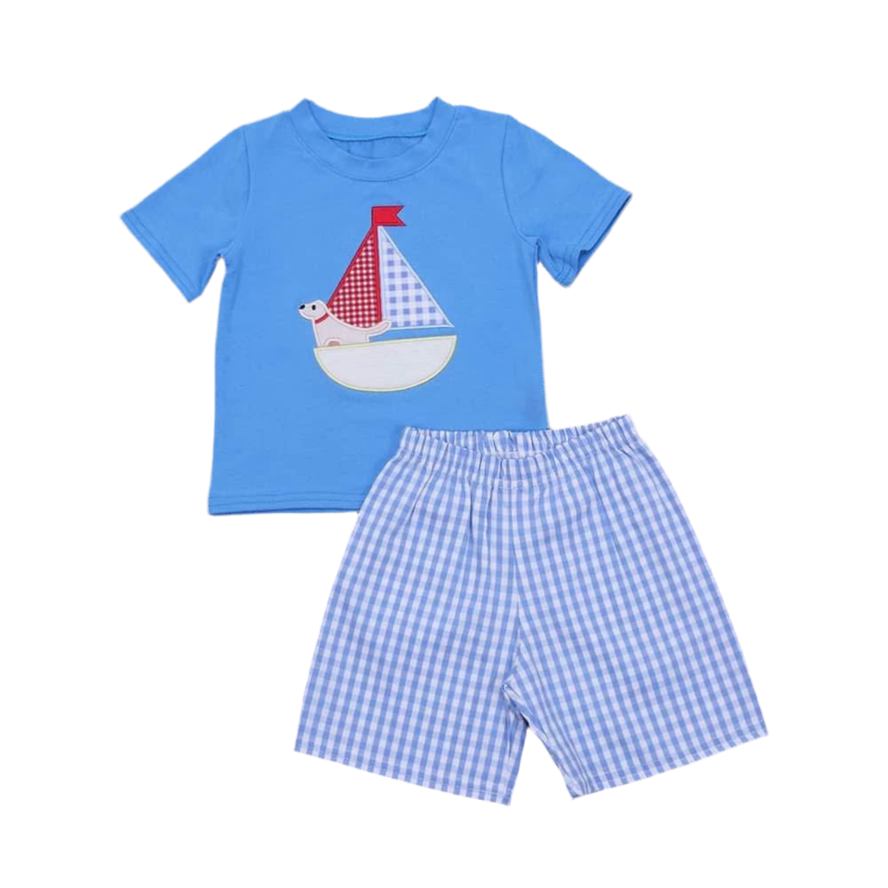 Ready to sail into cuteness! This playful set features a soft blue tee with a sailboat and puppy appliqué, paired with coordinating blue gingham shorts. Perfect for summer outings and picture-perfect moments.