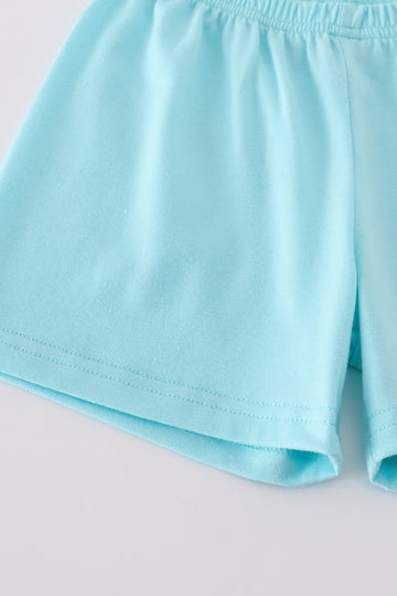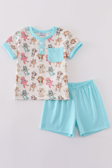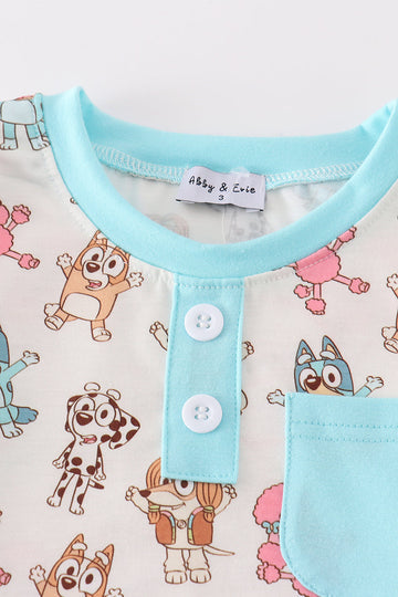 Comfy, playful, and full of Blue charm! This cotton-spandex set features an adorable puppy print top with aqua trim, pocket detail, and matching soft aqua shorts. A fun everyday outfit that’s as stretchy as it is cute!