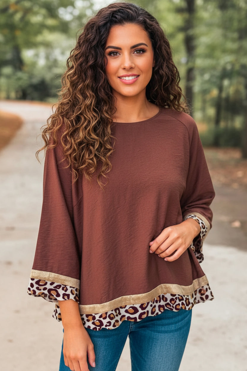 Effortlessly chic and incredibly versatile, this loose-fitting top works beautifully with any body shape. The eye-catching leopard hem detail adds a sophisticated edge, while the 7/8 raglan sleeves keep the vibe relaxed and contemporary. Crafted from lightweight, breathable fabric, it's the perfect companion to your favorite tailored pants or casual denim. Style it up or down—this piece adapts to your mood