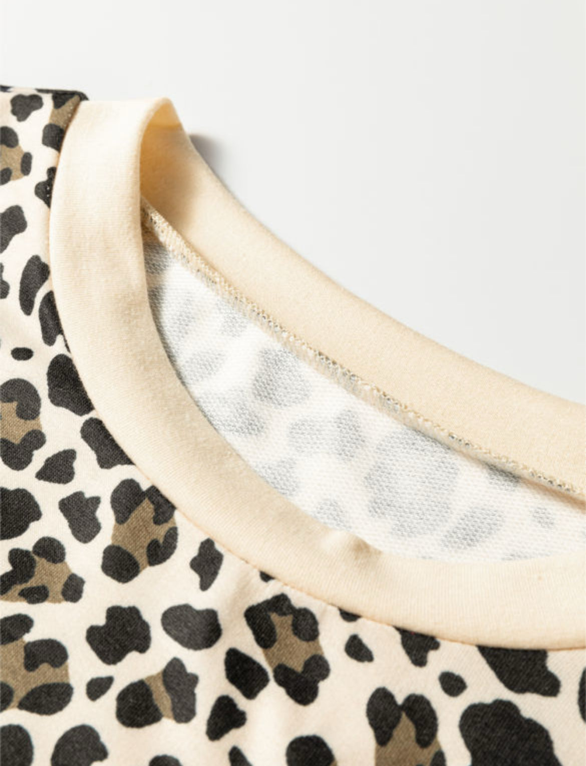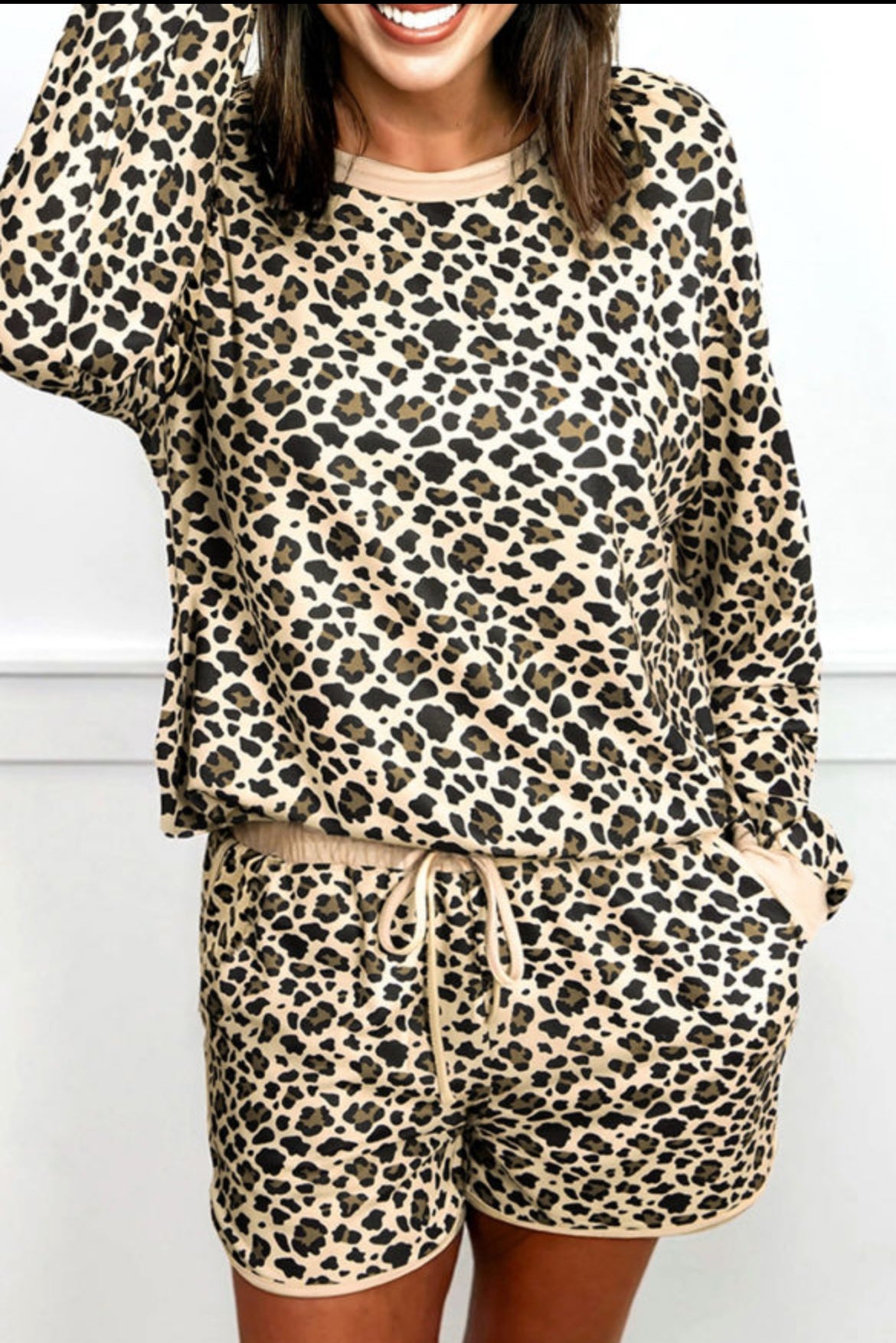 Brown Leopard Print Contrast Trim Long Sleeve Pullover Drawstring Shorts 2pcs Outfit