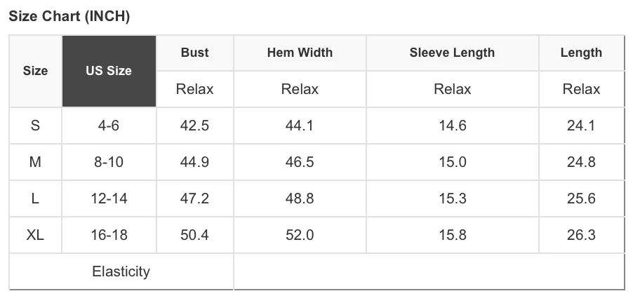 Size chart in photos