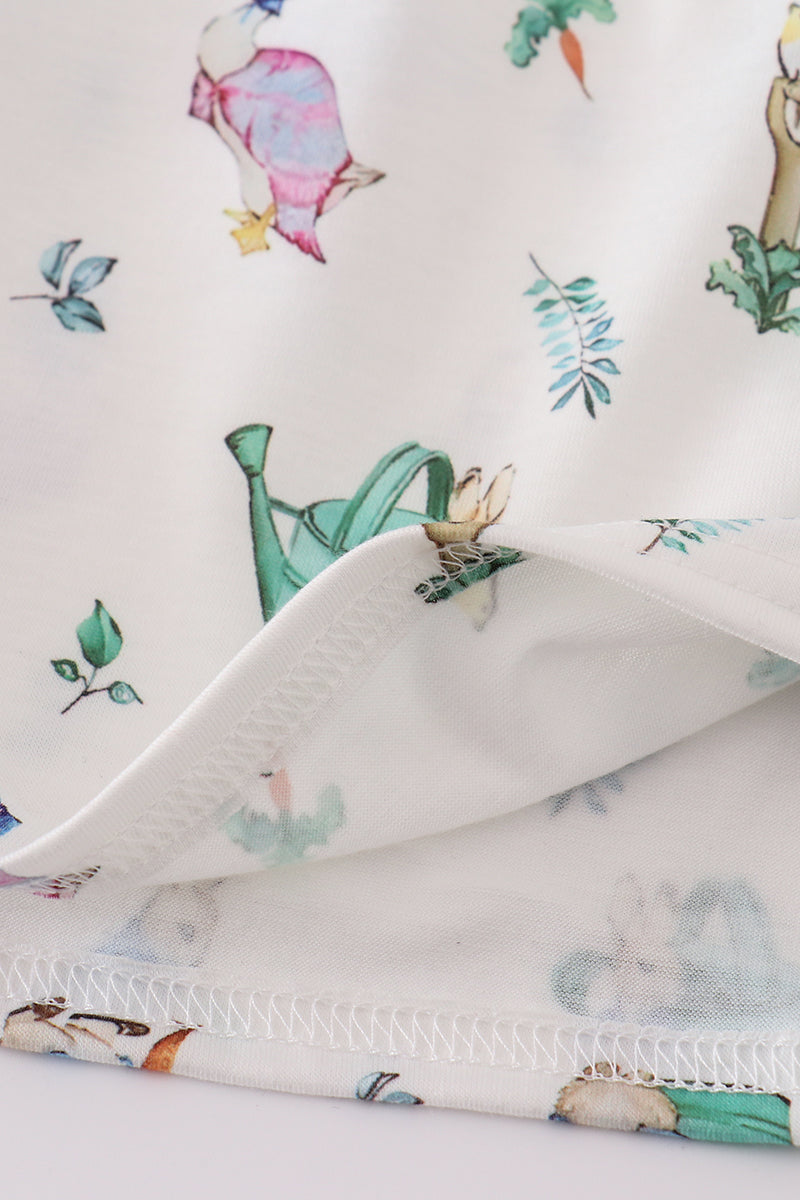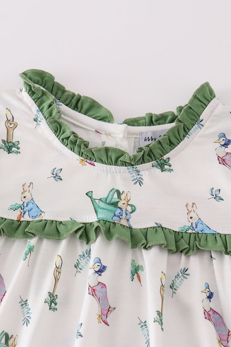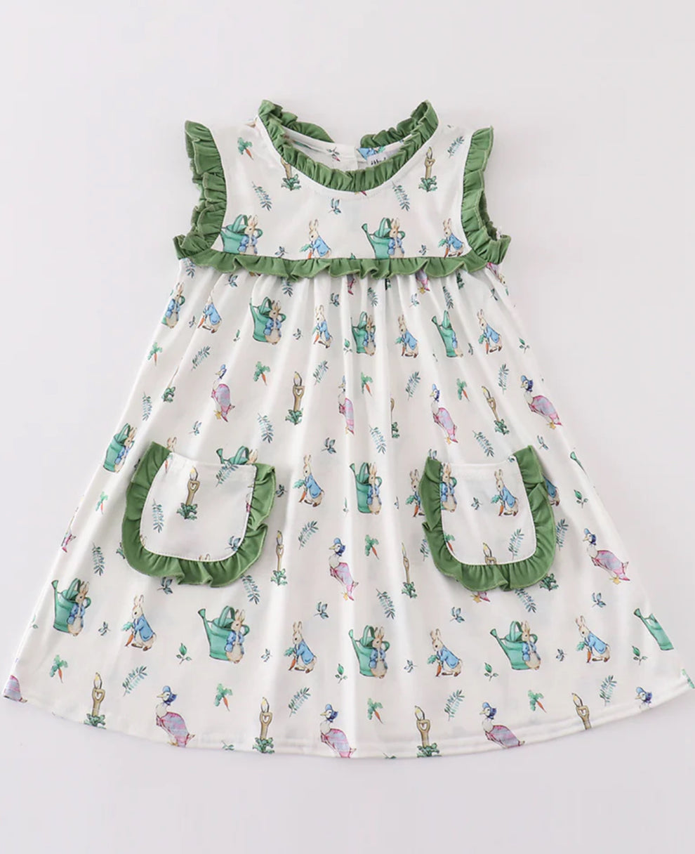 This sweet ruffle-trimmed dress features a charming bunny and garden print with cute green pocket accents. Soft, comfy, and perfect for play or pictures!