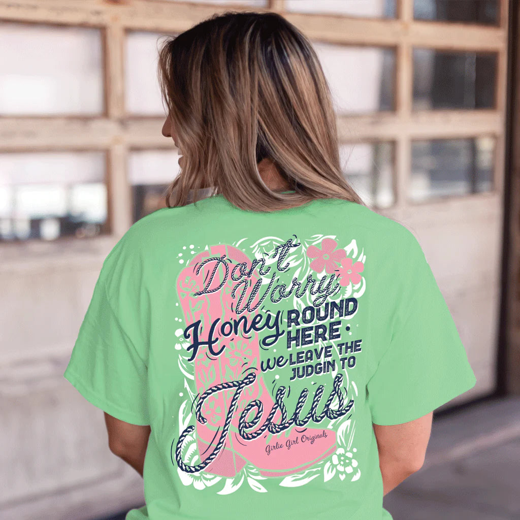 • 🌸 Graphic back: "Don't Worry Honey... we leave the judgin' to Jesus"