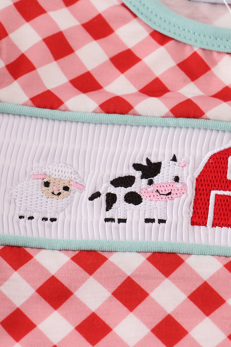 Featuring a classic red gingham print, farm animal smocked detail across the chest, and playful aqua ruffle trim with sweet white bows — it’s a showstopper from top to bottom.