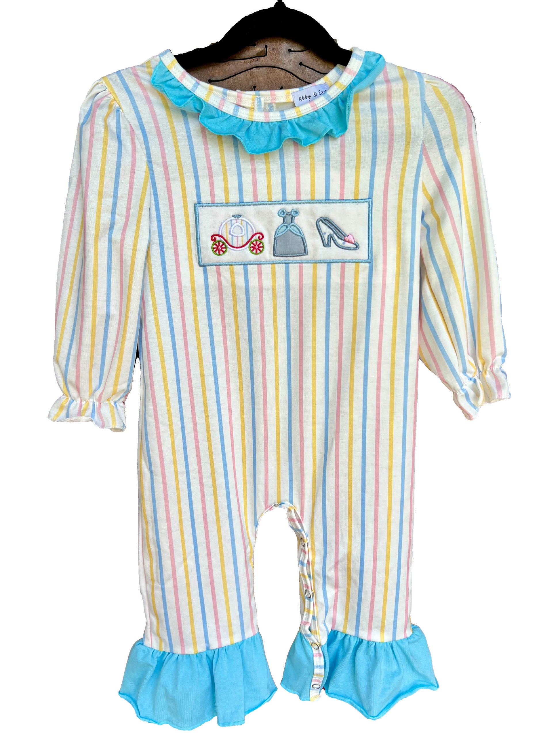 This darling romper is full of charm with its pastel stripes, princess-themed embroidery, and bright blue ruffle accents. The stretchy cotton blend keeps your little one comfy while the snap closure makes changes a breeze.