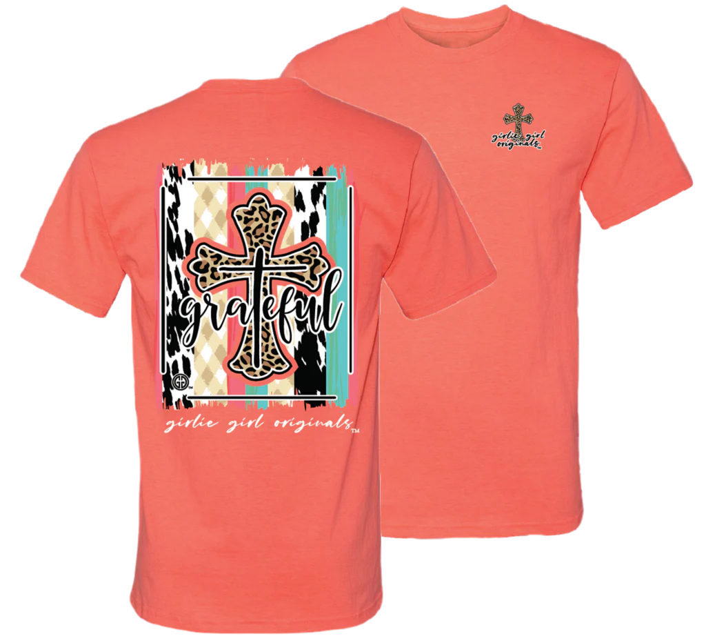 Faith, color, and a little sass—this “Grateful” tee from Girlie Girl Originals is a bold reminder of what matters most. Featuring a leopard-print cross over multicolor brush strokes and script lettering, it’s perfect for everyday wear or casual Sunday style.