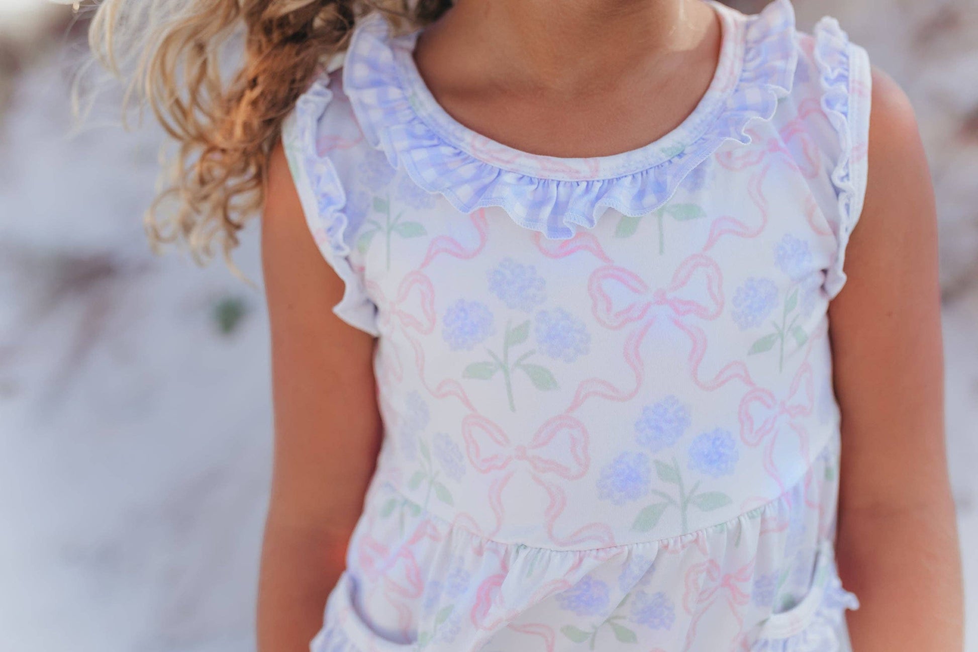 Girls Lavender Check & Pink Bow Pocket Ruffle Short Set