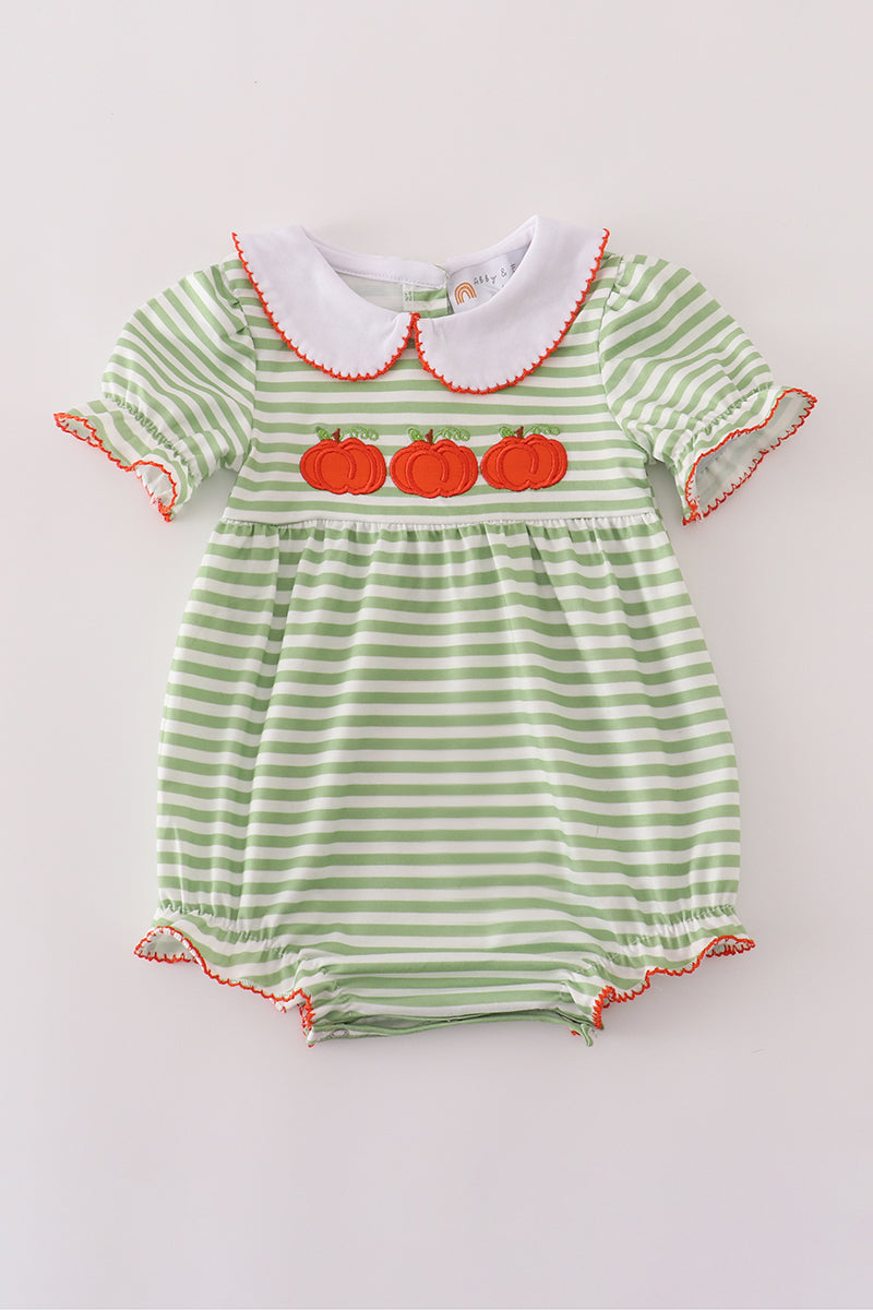 A festive twist on classic fall style! This green and white striped romper features bright pumpkin embroidery, a sweet scalloped collar, and pops of orange stitching. Soft, stretchy, and perfect for all-day wear from pumpkin patches to playdates.