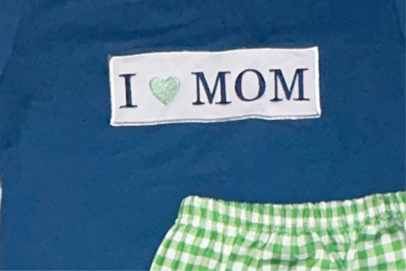 A sweet little outfit with a big message! This comfy two-piece set features a soft blue tee with an “I 💚 MOM” patch and bright green gingham shorts with a matching blue back pocket.