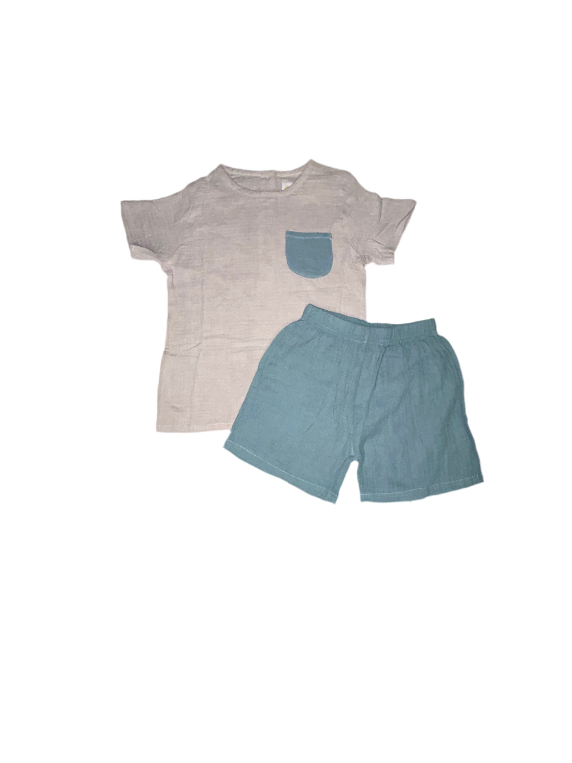 Keep it cool and comfy with this soft, breathable cotton set! Features a beige short-sleeve tee with a contrasting blue chest pocket, paired with matching lightweight cotton shorts.