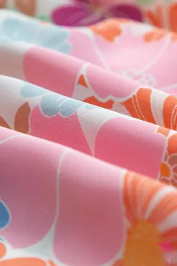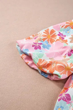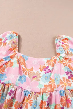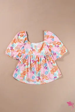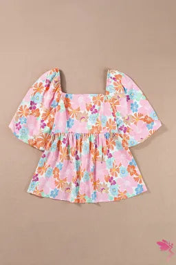 Pink Floral Puff Sleeve Square Neck Babydoll Blouse