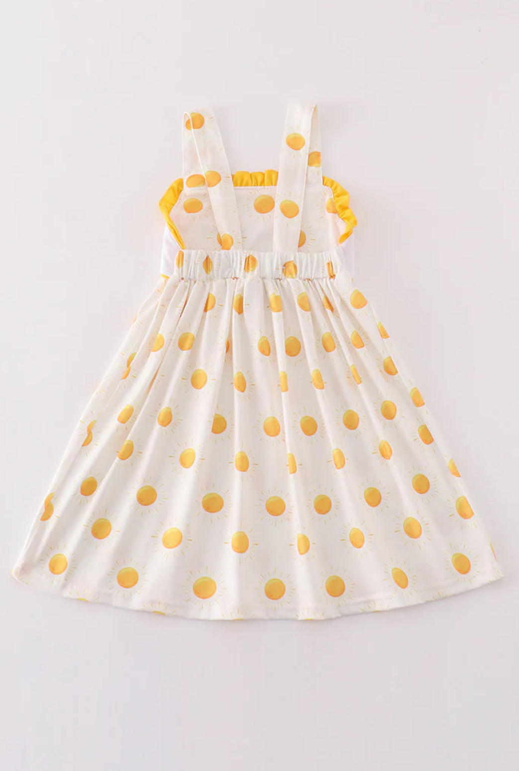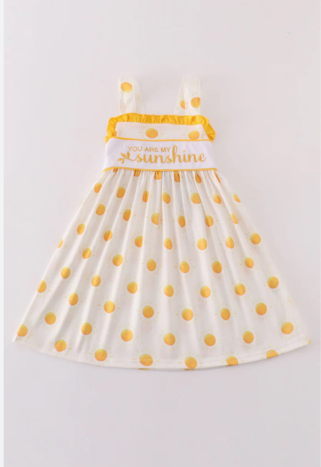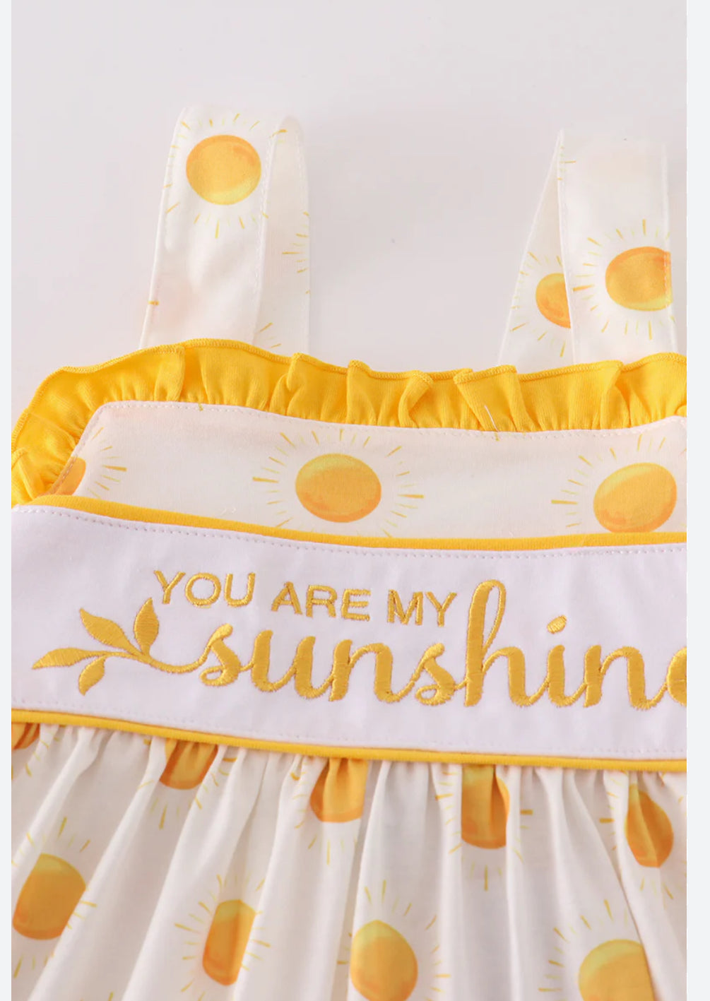 This sweet sunshine-print dress is perfect for sunny days! Features soft ruffle straps and “You Are My Sunshine” across the chest for a cheerful
