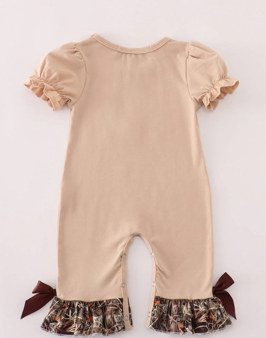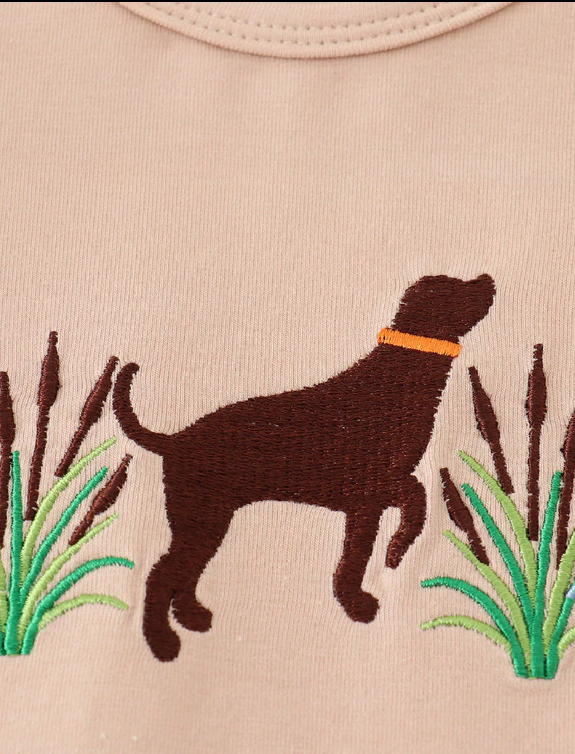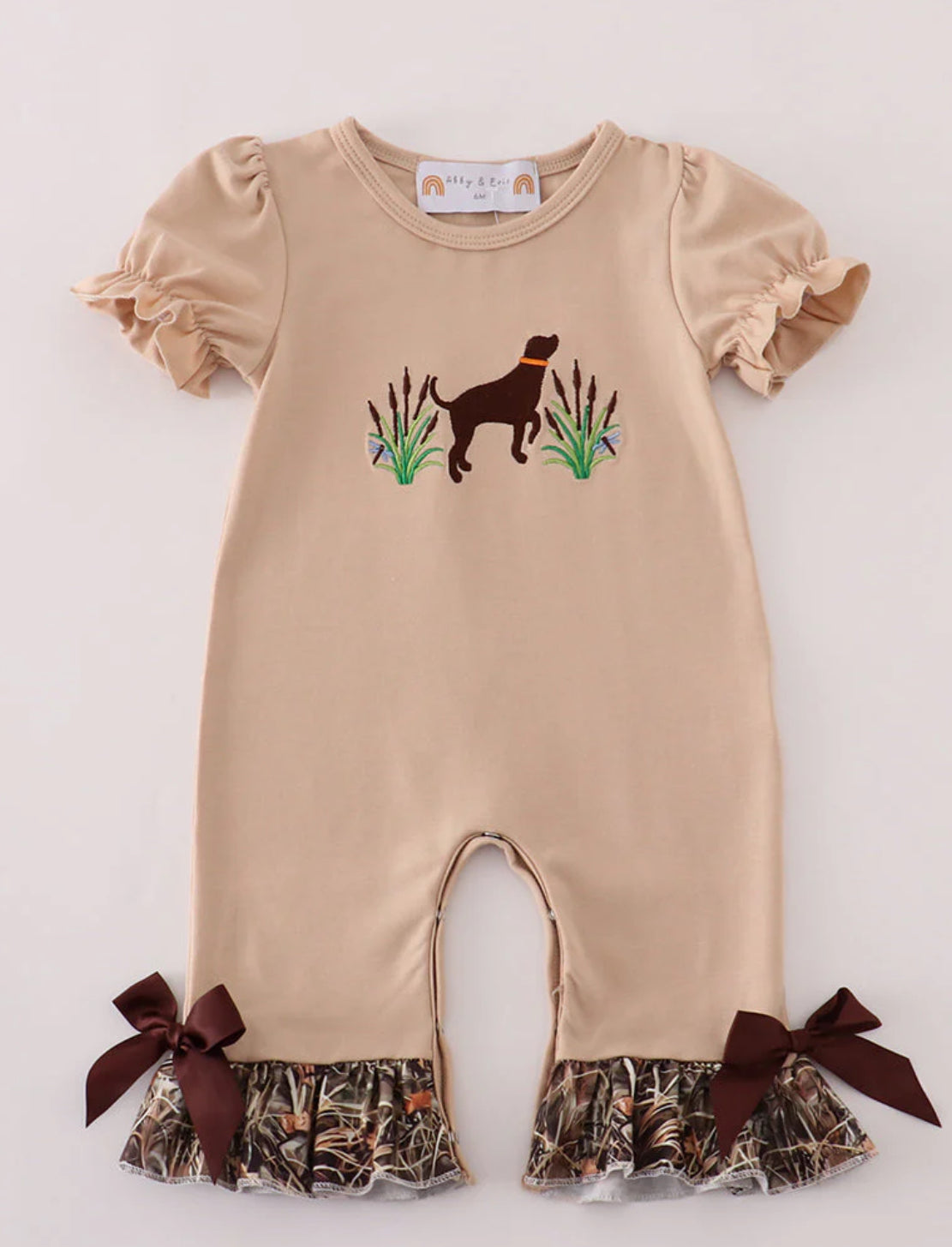 A Southern classic with a hunting twist! This adorable baby romper features a chocolate lab appliqué with cattail embroidery, flutter sleeves, and camo ruffle trim finished off with sweet brown bows.