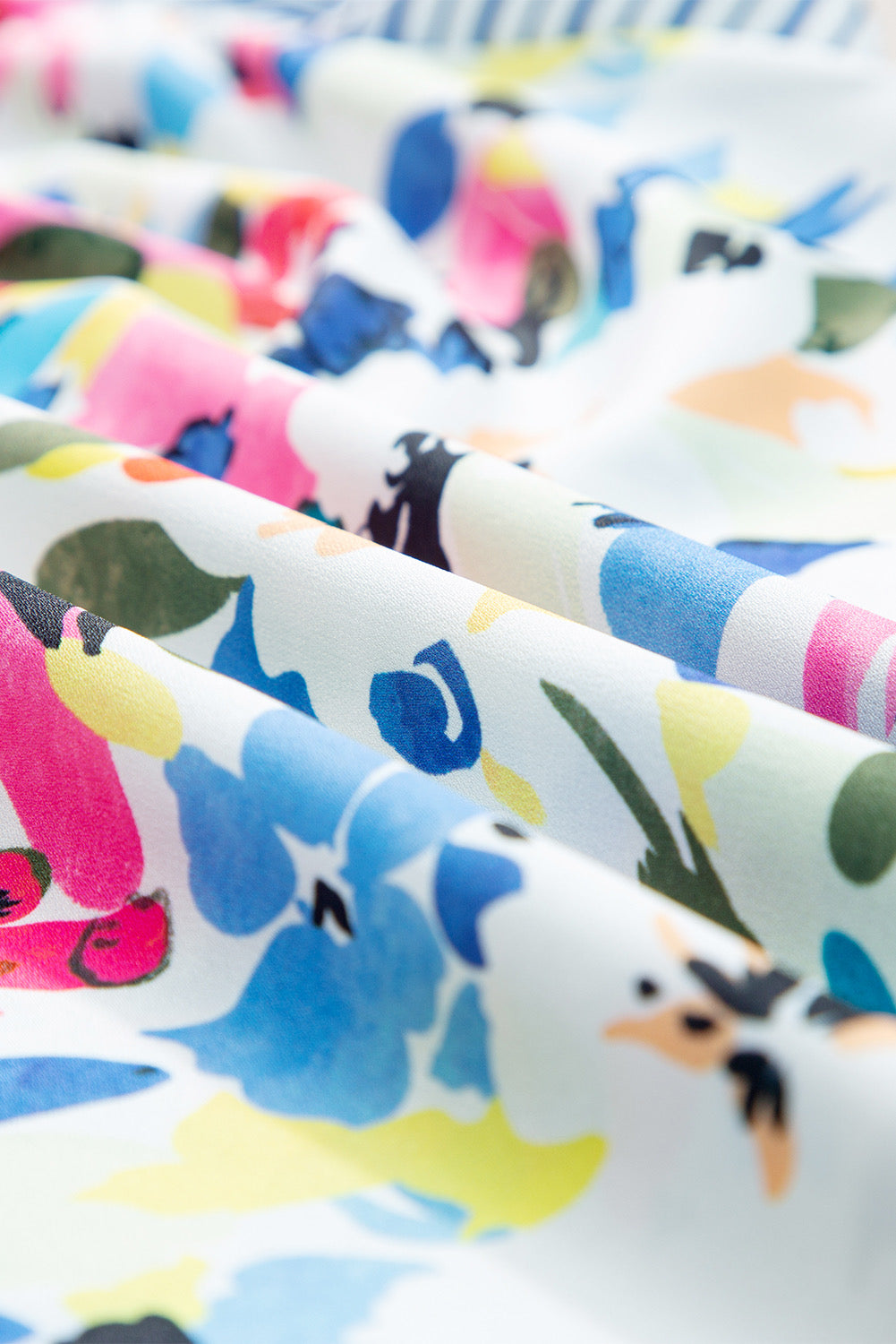 Bright floral ruffle top with striped sleeves — lightweight 100% polyester and easy to dress up or down.