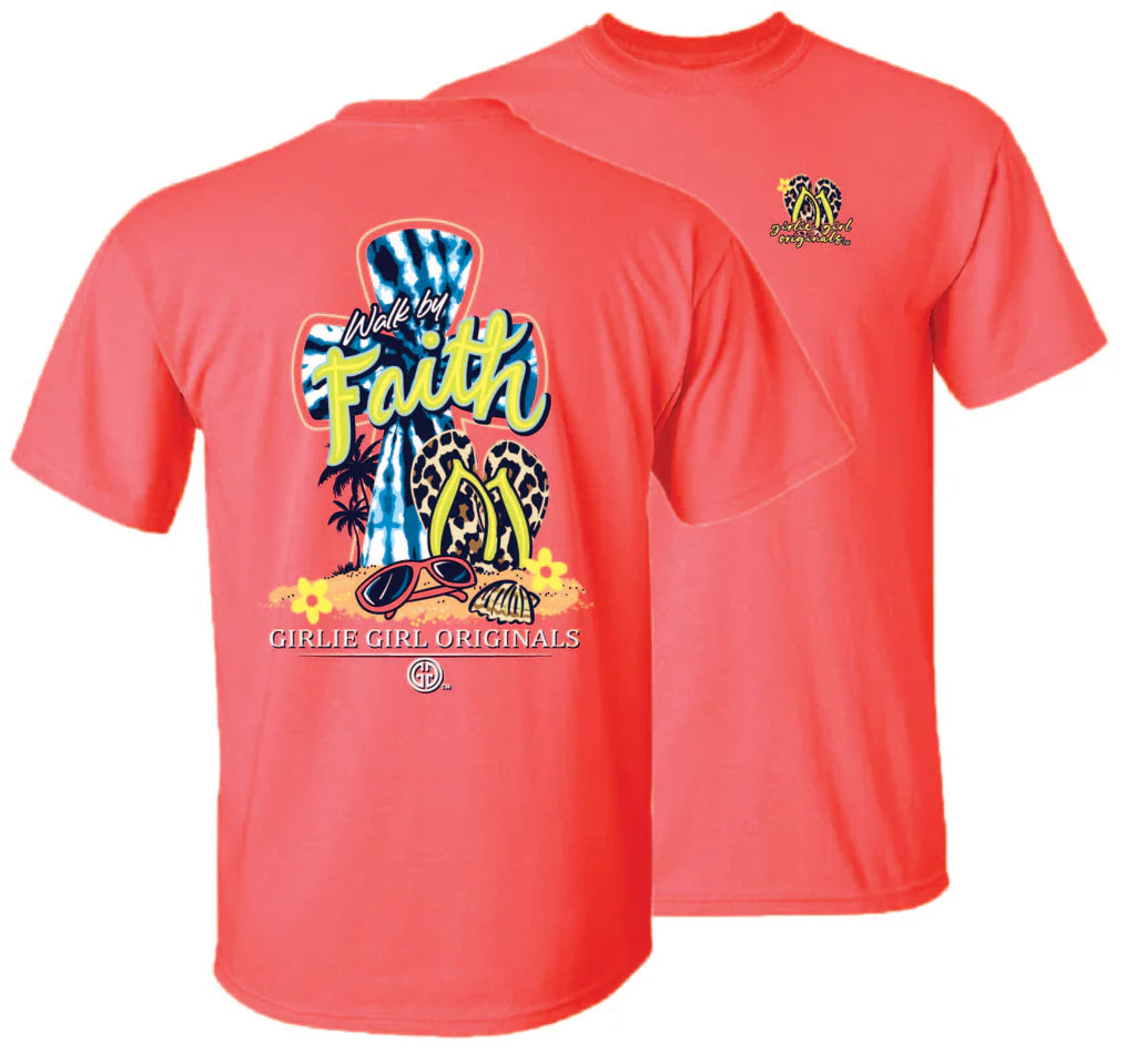Let your faith shine wherever you go with this vibrant Walk by Faith tee! Featuring a bold cross design with beachy vibes—flip-flops, sunglasses, seashells, and flowers—this coral tee brings summer fun and inspiration together. The back showcases a bright graphic with “Walk by Faith” lettering, while the front left chest features a matching mini design.