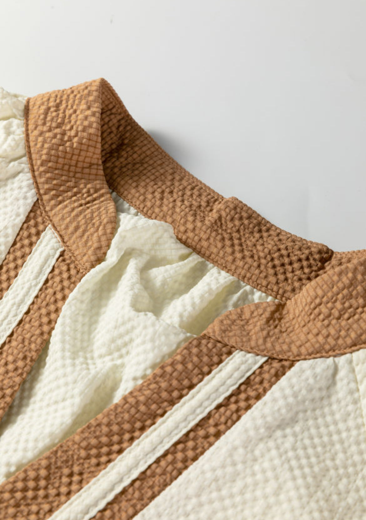 Elevate your casual wardrobe with this striking colorblock V-neck blouse. Contrasting patchwork details at the neckline and cuffs create a bold visual impact, while the collared design and subtle slit neckline offer timeless elegance. Puff sleeves add a feminine touch that feels both modern and refined. Crafted from lightweight, soft fabric, this blouse delivers all-day comfort without compromising on style—perfect for effortless layering or standalone wear.