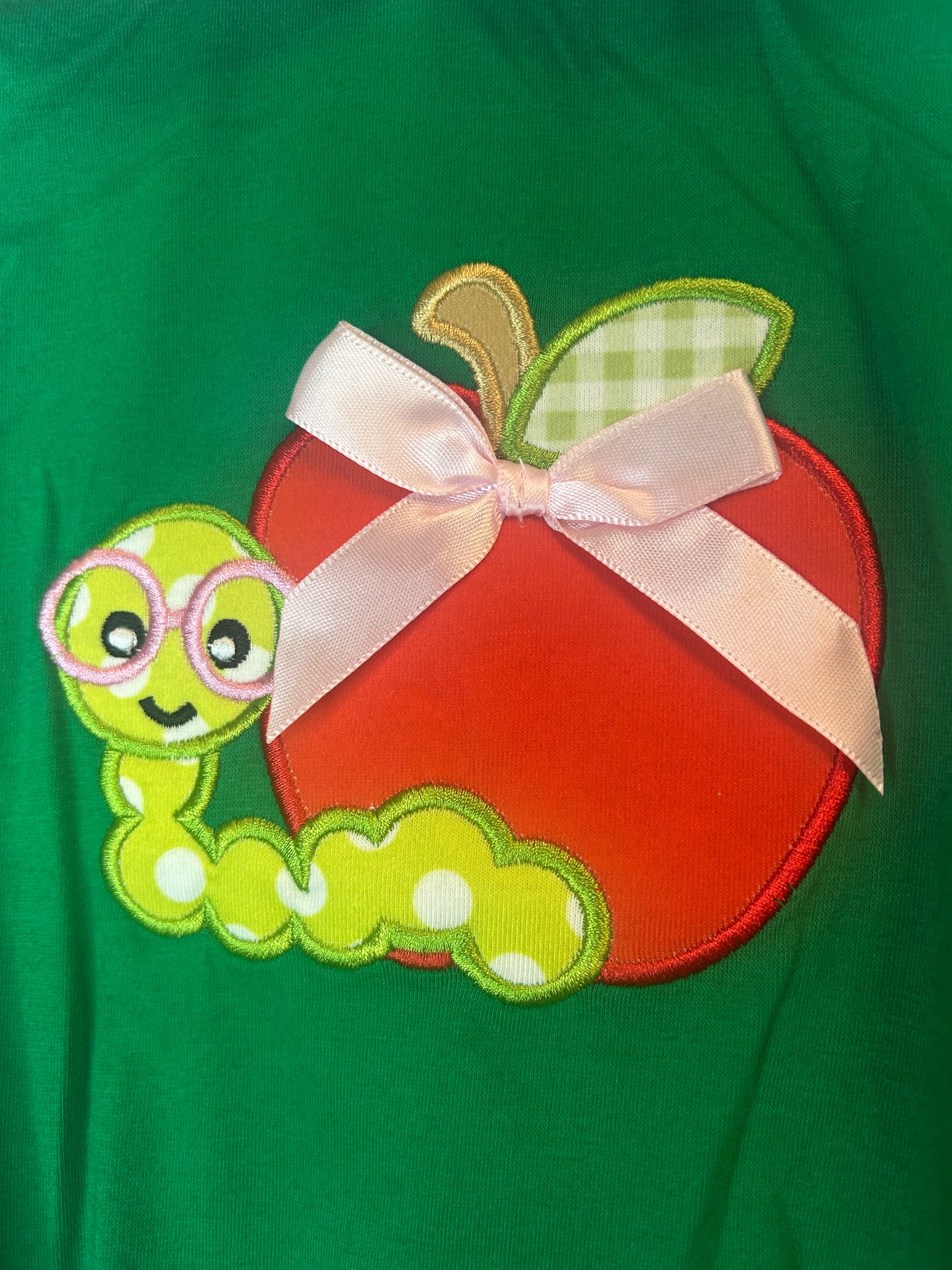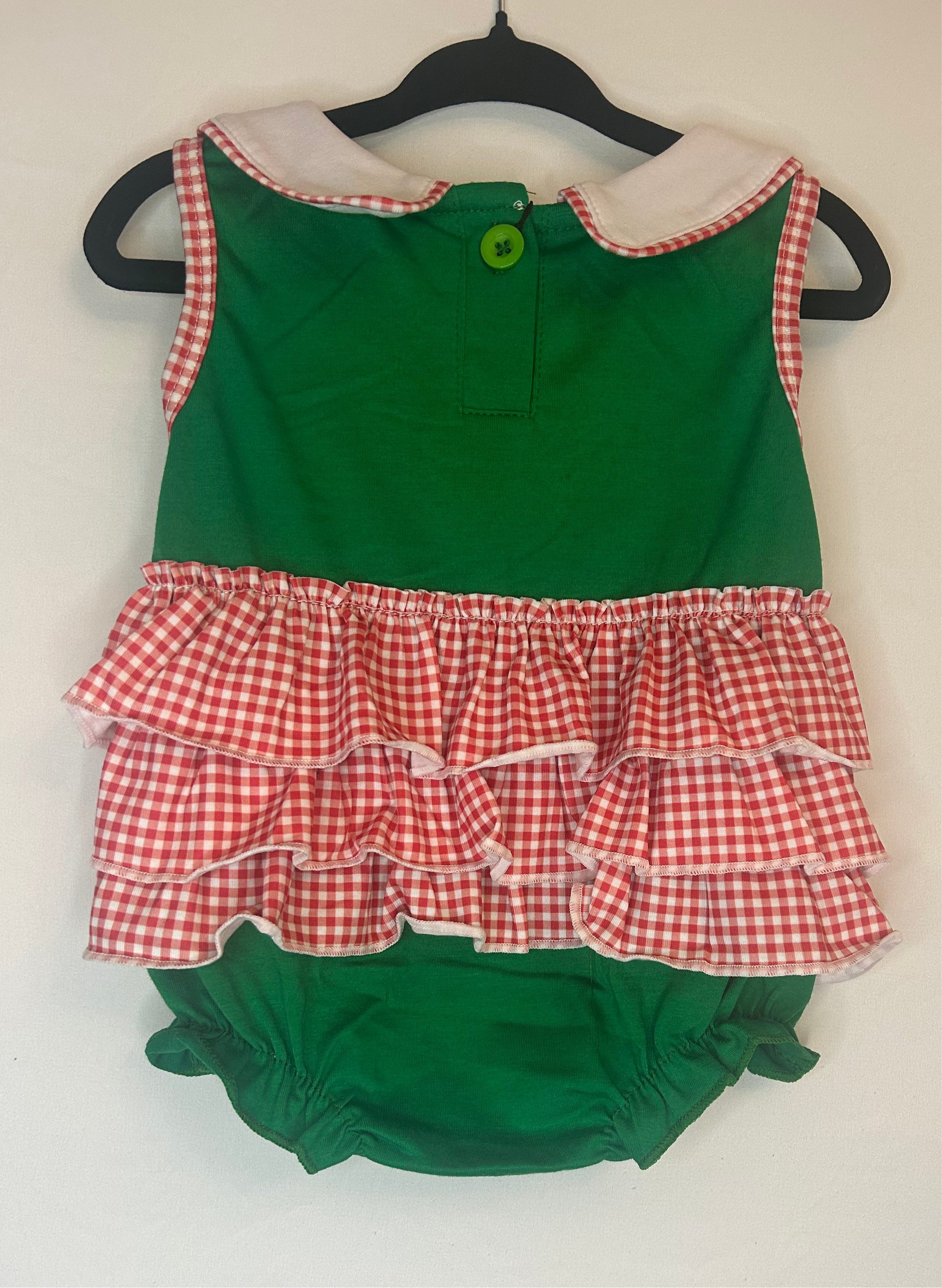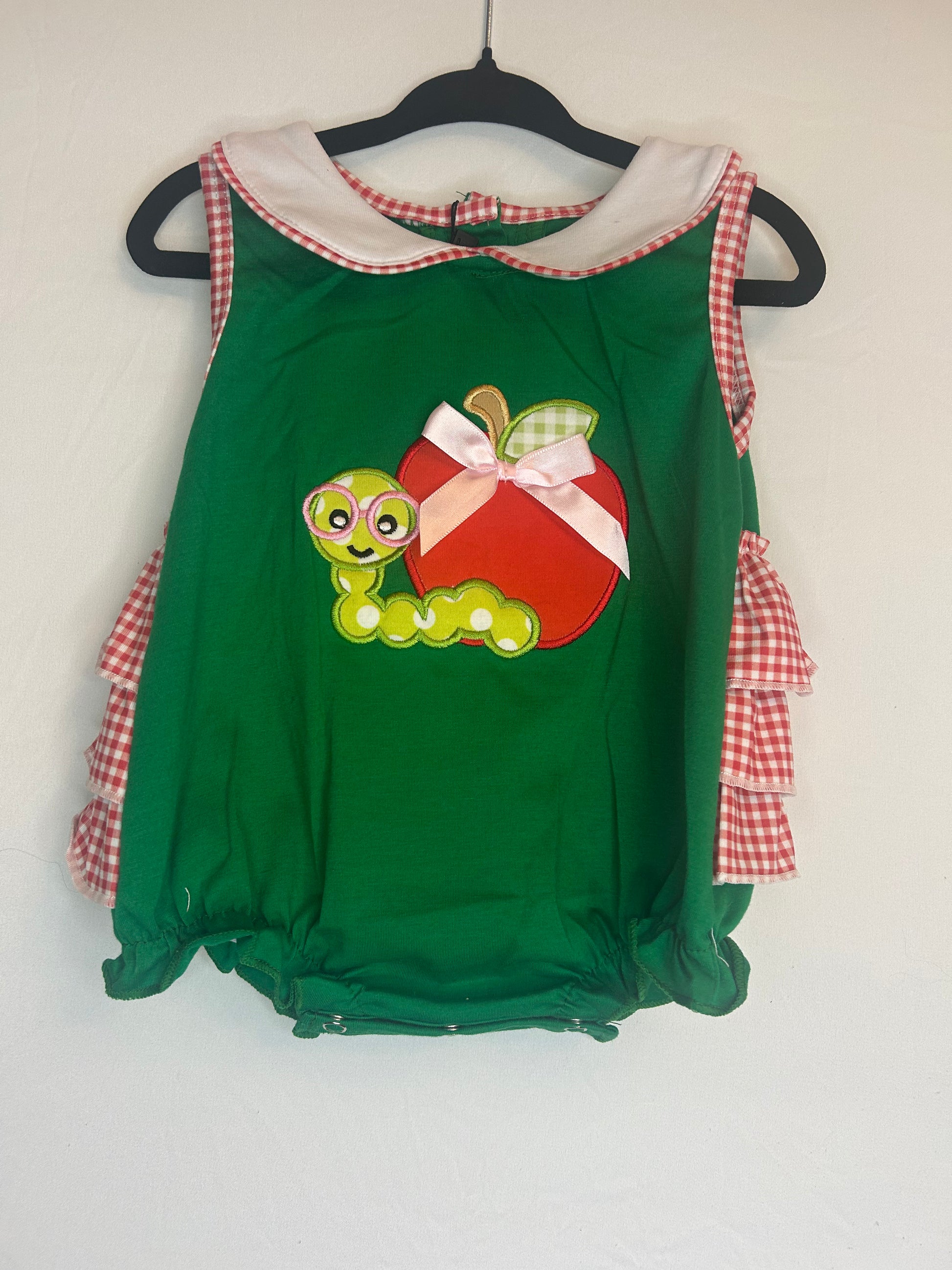 Sweet as can be! This adorable green bubble romper features a fun apple and worm applique with a satin bow and the cutest red gingham ruffle details on the back.